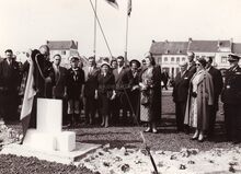 Onthulling van het monument naar aanleiding van de feestelijke opening van de nieuwe nautische basis van de sea-scouts langs het kanaal Oostende-Brugge. We herkennen burgemeester Adolf Van Glabbeke, centraal zijn echtgenote, achter de burgemeester, Raymond Miroir, schepen en uiterst links, Omer Vilain, stadbibliothecaris.