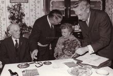 Schepen Raymond MIROIR op bezoek bij een gouden paar.Rechts afdelingschef burgerlijke stand VANLERBERGHE.