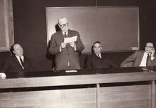Schepen Marie-Jozef Porta, derde van links, luistert naar een speech van de voorzitter van de Leopoldisten. Tweede van rechts, Maurice Quaghebeur en ernaast hem een zoon van schepen Porta