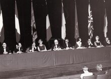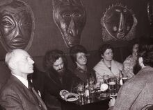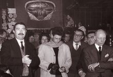Uiterst links Marie-Jozef PORTA schepen op een bijeenkomst met kunstenaars (?).