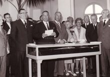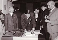 Burgemeester Jan PIERS tekent een gulden boek bij de opening van een tentoonstelling (in het Kursaal ?),schepen Marie-Jozef PORTA staat links en schepen Kamiel DEHOUCK rechts,naast de burgemeester nog NOrbert VANDERCRUYSSEN,feestleider Mariajerke.