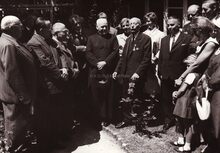 Schepen Marie-Jozef Porta en zijn zoon bij enkele gedecoreerde Leopoldisten (veteranen Leopold III).