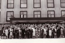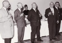 Bijeenkomst in het Kursaal,derde van links schepen Jan FELIX,vijfde schepen Raymond MIROIR,uitsers links Frank EDEBAU stadsconservator,naast hem John HERMANS,journalist en gemeenteraadslid.