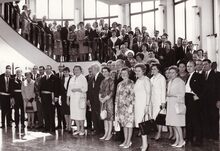 Ontvangst van een groep op het stadhuis, over de trapleuning leunend schepen Kamiel DEHOUCK. Uiters links schepenen Marie-Jozef PORTA en Jozef VAN DEN KIEBOOM, John LAUWEREINS ,waarnemend burgemeeste,r vijfde van links.