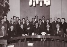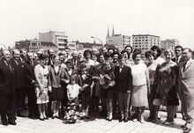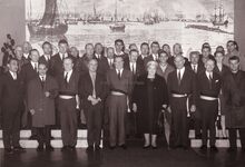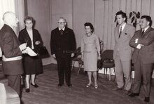 Een vaderlandse vereniging wordt ontvangen op het stadhuisUiterst links Theo DEHAENE liberaal voorman, derde van links Marie-Jozef PORTA,centraal Jan PIERS burgemeester en dan naar rechts schepenen Jozef VAN DEN KIEBOOM en Maurice QUAGHEBEUR.