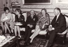 De collegezaal in het stadhuis,burgemeester Jan PIERS (centraal) en het college ontvangen een groep ter gelegenheid van de overhandiging van de stadsmedaille.Zittend van links naar rechts onbekend en dan de schepenen Marie Jozef PORTA,John LAUWEREINS,de burgemeester,en de schepenen Kamiel DEHOUCK en Maurice QUAGHEBEUR.