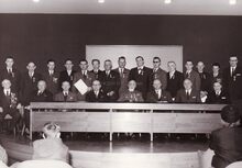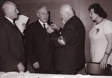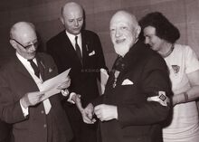 Burgemeester Adolf VAN GLABBEKE vereremerkt een onbekende?. Van rechts naar links, tweede Marie Jozef PORTA ,Michel SURMONT, stadssecretaris, Kamiel DEHOUCK,schepen, Emiel VROOME schepen, dan de burgemeester en verder Maurice QUAGHEBEUR en Jan PIERS schepenen.