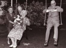 Schepen Marie-Jozef PORTA,achter de dame op de schommel, amuseert zich met enkele genodigden in de tuin van zijn woning aan de Van Iseghemlaan (?).