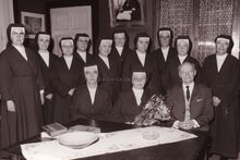 Ontvangst van schepen Marie-Jozef Porta door de Dochters van Liefde van Sint-Vincentius a Paolo. Kloostergemeenschap in de Langestraat 83. Staand van links naar rechts : de Zusters Thérèse, Marguerite, Katrien, onbekend, Zoë, onbekend, Jeanne, onbekend, Louise, Vincent. Zittend : Zuster Martine, onbekend en de heer Porta.