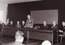 Uitreiking van eretekens in de conferentiezaal van het stadhuis. Aan de tafel zittend centraal een militair (op rust). Tweede van links, Marie-Jozef Porta, tweede van rechts, schepen Maurice Quaghebeur sr. en naast hem Felix Porta.
