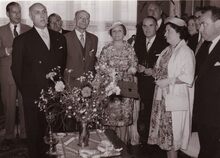 Drink in huize Monaco aan de Van Iseghemlaan, consulaat van Monaco en tevens woning van de familie PORTA. Uiterst rechts staat Marie-Jozef PORTA, consul van Monaco en schepen,derde van rechts zittend deken BUTAYE ,achteraan links burgemeester Adolf VAN GLABBEKE en mevrouw,in de rechter hoek achteraan John HERMANS,journalist en gemeenteraadslid. Samenkomst ter gelegenheid van het huwelijk Rainier van Monaco met Grace KELLY.
