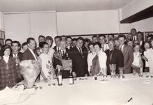 Schepen Marie-Jozef PORTA de Vlaamse Leeuw (?) wordt gehuldigd in het lokaal van, Mariakerke Sport Club (?);naast hem Norbert VANDERCRUYSSEN,feestleider Mariakerke.