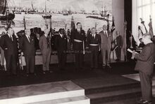 Burgemester Adolf Van Glabbeke houdt zijn toespraak, tweede van rechts, schepen Raymond Miroir