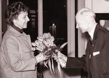 Schepen Marie-Jozef PORTA op bezoek bij de oude zeebonken in het GODTSCHALCK Zeemanshuis. In de bloemen de directrice mevrouw Marie-Louise VANDENBERGHE.