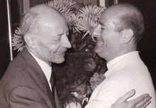 Schepen Porta omhelst de 100 jarige Sylvie FOCKEDEY bij haar viering,links kijkt schepen Jan PIERS toe links achteraan schepen Maurice QUAGHEBEUR.