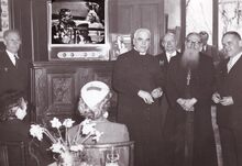 Een groep onbekende kerkelijk (?) gedecoreerden voor de ingang van de Sint Petrusen Pauluskerk.