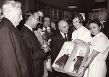 Burgemeester Adolf VAN GLABBEKE ontvangt een ruiker van een onbekende dame. Foto genomen op de Visserskaai. Achter de burgemeester een hostess van Expo 58.