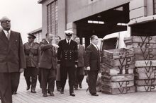 Inhuldiging door burgemeester Adolf Van Glabbeke van de garnaalmijn. Uiterst rechts Frank Zanders, secretaris-ontvanger van de vissershaven.
