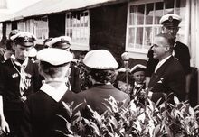 Burgemeester Adolf Van Glabbeke speecht bij de inhuldiging van het sea-scoutslokaal langs het kanaal Oostende-Brugge