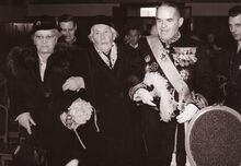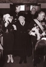 Burgemeester Adolf VAN GLABBEKE met de 100 jarige Sylvie STALMANS-FOCKEDEY aan de arm tijdens haar ontvangst op het stadhuis. Links achter schepen Jan PIERS, uiterst rechts, deurwachter Henri LANOYE. Wwe STALMANS-FOCKEDEY, Blauwkasteelstraat 65 was de eerste honderdjarige die op de parochie Sint-Jan wordt gehuldigd.