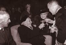 Burgemeester Adolf VAN GLABBEKE klinkt met de 100 jarige Sylvie FOCKEDEY ter gelegenheid van haar ontvangst op het dd. stadhuis (huidig Gerechtshof).