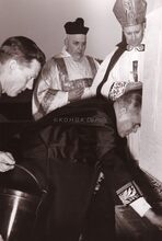 Burgemeester Adolf VAN GLABBEKE in kerkelijk gezelschap ,links achteraan deken BUTAEYE, rechts de bisschop van Brugge, Emiel DE SMEDT. Eerste steenlegging Onze Lieve Vrouw Koninginkerk Mariakerke.