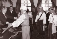 Burgemeester Adolf VAN GLABBEKE en schepen Maurice QUAGHEBEUR vereremerken leden van een folkloregroep tijdens een ontvangst op het dd. stadhuis (huidig Gerechtsgebouw).