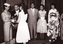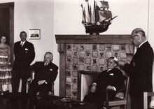 Burgemeester Adolf Van Glabbeke ontvangt de Japanse gezant te Brussel Eyi Wajima, zijn echtgenote en delegatie naar aanleiding van een tentoonstelling van Japanse poppen en tekeningen in de Stedelijke Basisschool Albert. Meer info : Zeewacht, 09/08/1957, p.7