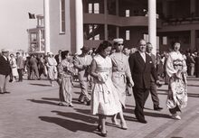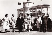 Burgemeester Adolf VAN GLABBEKE en Japanse genodigden op de Wellingtonrenbaan. Tussen de burgemeester en de mevrouw in Japanse klederdracht, schepen François VAN CAILLIE. De vrouw links naast de burgemeester is (onder voorbehoud) de echtgenote van Eyi Wajima, de Japanse gezant te Brussel. Zij waren in Oostende op uitnodiging van het stadsbestuur naar aanleiding van een tentoonstelling van Japanse poppen en tekeningen in de stedelijke basisschool Albert