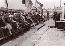 Burgemeester Adolf Van Glabbeke houdt een toespraak naar aanleiding van de eerste steenlegging van het stedelijk speelplein Duin en Zee. Op de achtergrond het militair hospitaal.