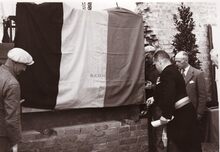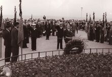 Burgemeester Adolf Van Glabbeke, derde van rechts, en schepen Emiel Vroome, tweede van links, bij de plechtigheid "Fakkel der Zee" aan het monument der gesneuvelden op het Sint Petrus en Paulusplein. Op de achtergrond het Zeestation? Het alleenstaand wit gebouwtje rechts, was ook een openbaar urinoir, gekend om zijn geurverspreiding