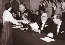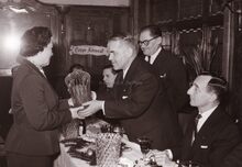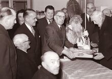 Burgemeester overhandigt een kristallen vaas aan een onbekende dame, naast hem zit (links) Jan PIERS schepen, de latere burgemeester. Uiterst rechts de heer NATAN (eigenaar van de confectiezaak "A la Ville de Londres")