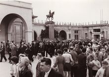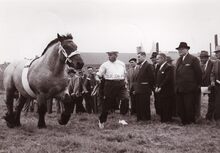 Burgemeester Adolf VAN GLABBEKE op een "hengstenkeuring" op de Wellingtonrenbaan.De hengst Aiglon de Vierset draaft voorbij.