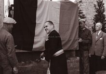 Burgemeester Adolf Van Glabbeke bij een vaderlandse plechtigheid aan het monument der gesneuvelden op het Sint Petrus en Paulusplein. Achteraan rechts, staat schepen Jan Piers. Op de achtergrond de Visserskreek, thans gedempt, en een vleugel van het Zeewezengebouw aan de Natiënkaai.