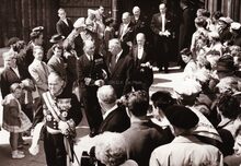 Burgemeester Adolf VAN GLABBEKE in vol ornaat verlaat de Sint Petrus en Pauluskerk na het Te Deum, naar aanleiding van onze Nationale Feestdag op 21 juli. Achter hem drukt Dries CLAEYS, volksvertegenwoordiger een hoog Zeemachtofficier de hand.