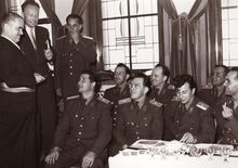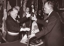 Burgemeester Adolf VAN GLABBEKE overhandigt een vaandel aan een oudstrijdersvereniging. Naast hem van links naar rechts, schepen Kamiel DEHOUCK, Roger DE KINDER, de latere provinciegouverneur van Oost-Vlaanderen.