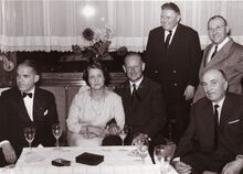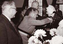 Burgemeester Adolf VAN GLABBEKE ten huize van de heer en mevrouw Max LIEDTS, rechtstaande achter de heer LIEDTS zijn zoon juwelier zoals hij. Naast mevrouw LIEDTS, de heer André VANDEPOELE (voorzitter van de handelaarsbond Het Kroontje en eigenaar van de melkhandel Antverpia-Milkpalace)