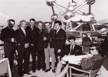 Burgemeester Adolf Van Glabbeke op de Expo 1958 bij het Oostends paviljoen. Links naast hem, Maurice Boel. Rechts, Raoul Servais en Willy Bosschem. Op de achtergrond het Atomium.