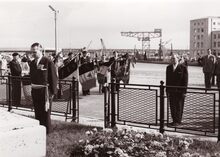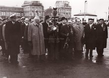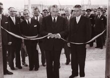 Inhuldiging van het bestuursgebouw van de RMT, aan de Natienkaai door Paul Willem SEGERS minister van verkeerswezen. Links van hem burgemeester Adolf VAN GLABBEKE, rechts Schepen Emiel VROOME. Achter de burgemeester, schepen Frans Van Caillie.
