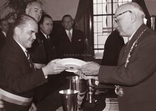 Burgemeester Adolf VAN GLABBEKE ontvangt de 100 jarige Sylvie FOCKEDEY op het dd. stadhuis, achter hem links schepen Jan PIERS en schepen Maurice QUAGHEBEUR,evenals hij in vol ornaat.