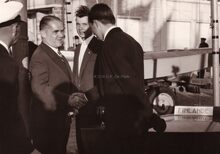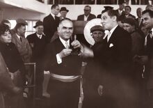 Burgemeester Adolf VAN GLABBEKE met Japanse genodigden op de Wellingtonrenbaan. Uiterst rechts : schepen François VAN CAILLIE