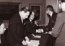 Burgemeester Adolf VAN GLABBEKE op een opening van een tentoonstelling in het Gerechtshof (toen dienstdoen stadhuis). Tentoonstelling van drie beeldende kunstenaars : Jacques BELVA, Robert VANHESTE en Marc PLETTINCK, uiterst rechts.