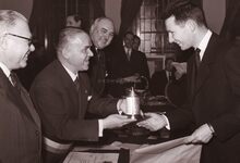 Burgemeester Adolf VAN GLABBEKE overhandigt in het dd. stadhuis (huidig Gerechtshof) een trofee aan de heer DERYCKER van de kledingszaak Caddy-Tailors. Naast hem schepen Maurice QUAGHEBEUR.
