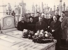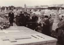 Jaarlijkse hulde aan het graf van kunstschilder Jan DECLERCK op het kerkhof Nieuwpoortsesteenweg. Centraal schepen Raymond MIROIR. Tweede van rechts, John HERMANS, journalist en gemeenteraadlid. Op de achtergrond de Troonstraat. De man uiterst links (met hoed in de hand) is Jacques ASAERT. De man met het zwarte hoedje is Ernest DETAEYE, links van hem staat Jozef MAES. Mevr. MAES-VANHOORNE legt bloemen neer.