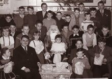 Feestleider Norbert Van der Cruyssen en de Kerstman tussen Mariakerkse kinderen op een Kerstfeest.