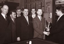 Schepen Kamiel DEHOUCk overhandigt een beker aan een biljartkampioen in café "In den As" te Mariakerke. Norbert VANDERCRUYSSEN, leider van het Mariakerks feestcomite, is er ook bij (vierde van rechts).