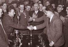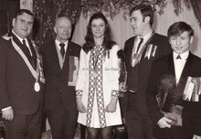 Prijswinnaars bij een ontvangst op het dd. stadhuis (huidig Gerechtshof).Rechtstaand vierde van rechts burgemeester Adolf VAN GLABBEKe,op de achterste rij tweede van links schepen Kamiel DEHOUCK.