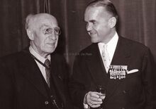 Middaguur. De receptie. Burgemeester Adolf Van Glabbeke in het gezelschap van fotograaf Maurice Antony (links).