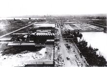 Β Rechts het Visserijdok dat nog nietΒ volledig gegraven is. De grond van deze opgravingen werd gebruik voor de opspuiting van "het stort". Midden links de Vuurtorenwijk en erachter de Spuikom.Β Vooraan links de ijsfabriekΒ "FroidΒ Industriel", RederijkaaiΒ 13.