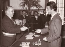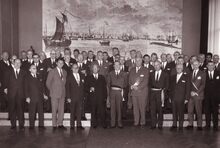 Ontvangst van een boogschuttersgilde op het stadhuis.Centraal John LAUWEREINs,schepen dd. burgemeester,helemaal rechts Maurice QUAGHEBEUR,notaris en schepen.